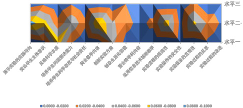 为了更加细致地研究教学行为与课程标准更侧重于哪些主题的哪些水平并对比其异同,本研究将利用归一化处理的比率数据,绘制能体现重点分布的曲面图。课程标准要求的曲面图如图2 所示。其中,横坐标表示课程标准对演示实验教学行为不同维度的具体要求,纵坐标表示不同维度要求对应的水平,位于不同的颜色区域的网格线交点表示某个演示实验教学行为要求的水平在总体上所占的比率。