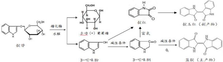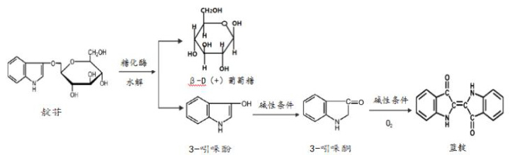 黔东南用于传统制靛的植物是马蓝,马蓝的茎叶经浸泡腐烂后,靛苷从植物细胞中溶解于水中,靛苷在糖化酶的作用下水解产生 3-吲哚酚和葡萄糖。3-吲哚酚在碱性条件下发生酮式互变异构现象生成 3-吲哚酮,两分子 3-吲哚酮在碱性条件下发生缩合、氧化反应生成难溶于水的蓝靛。工艺流程简化如下: