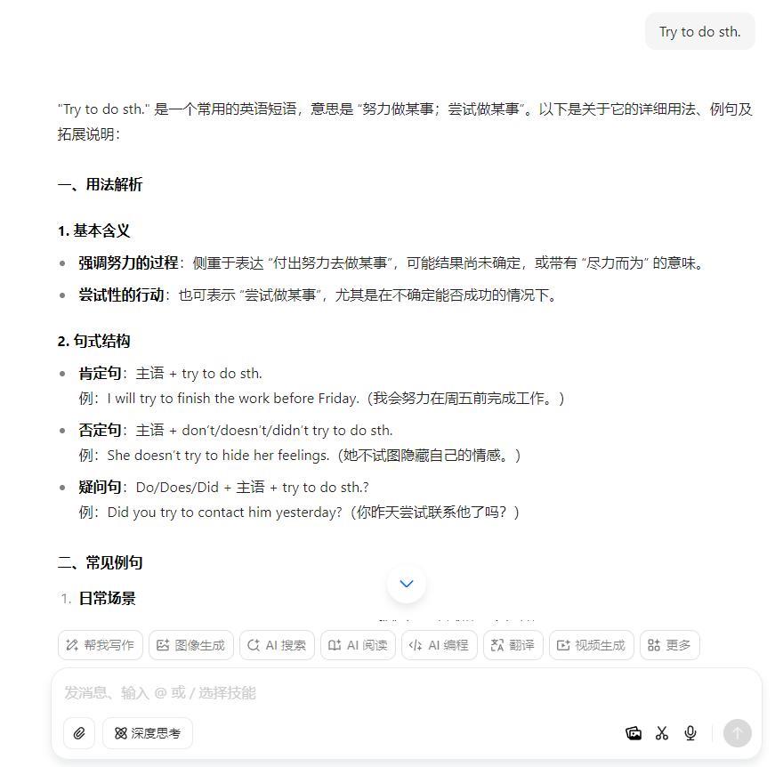 如在教学八年级英语 Unit6 An old man tried to move the mountains 这一内容时,借助于 AI 技术应用,组织学生开展角色扮演,并通过智能语音分析技术应用,帮助初中生改善发音,提升初中生英语能力及素养。又如,借助AI 技术应用,组织学生对本单元的核心词汇、短语内容等进行系统化学习。如联系核心词汇、短语等内容,借助豆包 AI 应用,引导学生深层次的学习及思考。以“try todo sth.”学习为例,利用 AI 生成学习资源,对学生学习进行针对性引导。