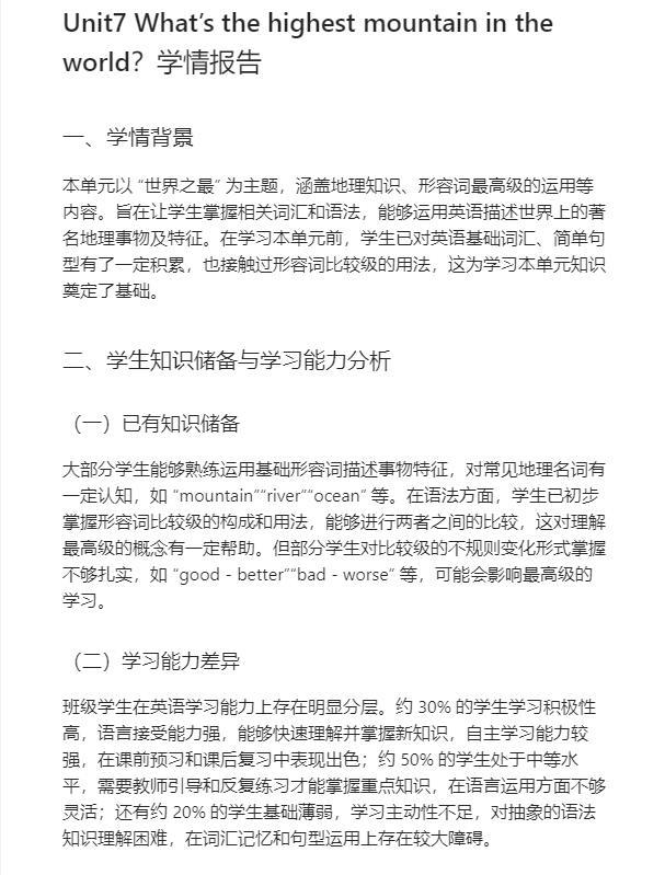 如结合生成式 AI 开展教学评价工作时,结合 Unit7 What’s the highest mountain in the world?这一单元内容,教学评价工作开展时,利用AI 生成该单元的主题语法题目,之后组织初中生与AI 对话交流,对初中生参与本单元学习活动的情况进行评估分析,把握初中生对单元单词、短语、句型、句式知识的学习及理解情况。结合AI 应用,生成学生学情报告。