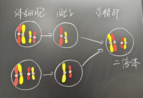 利用减数分裂染色体的模型进一步构建染色体组。染色体组对于学生来说总是一个难点,学生难以理解染色体组的定义。每 6 个学生为一组,每组两种形状,每种形状的每种颜色 4 条,一共 16 条染色体,让每组学生摆出一个染色体组,两个染色体组,三个染色体组