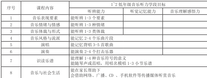 表二:《1~2 低年级音乐听力培养的学段目标★》