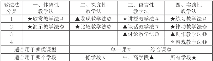 教学方法的选择主要考虑几个方面:符合音乐学科的教学规律原则;依据教学目标和教学任务原则;依据学生的学情和学段目标原则。依照这些原则,课题组优化了教学模式,创新了活动方式,增强音乐综合实践活动环节,实际运用后获得了实效。图表中课型概念单一课是指在一节课中主要进行某一种教学内容,完成一项主要的教学任务的音乐课。如合唱课、欣赏课、歌唱课等。综合课是指在一节课中有多种教学内容、多种教学任务的音乐课。如课中有歌唱、演奏、欣赏和音乐常识等教学内容和变化学习方式的音乐课。和原来的教学环节相比,我们根据班级学情差异增加了教学环节。这些环节的增加,不仅让学生在音乐课堂里学得更加扎实,而且锻炼了低学段学生的音乐表达能力,培养了中、高学段学生的自信心,潜移默化促进了学生的音乐思维发展。