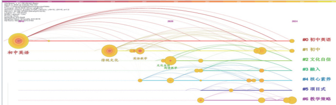 本选题是通过查阅各项相关的文献内容,并进行科学的分析来拟定。主要以中国知网为中文检索来源,以 EBSCO 教育学数据库为英文检索来源,分别检索关键词“中华传统文化”和“初中英语教学”,并以近十二年(2013-2025)为检索时间节点,剔除无关文献,共检索到中英文文献共 226 篇(文献检索时间为 2025 年 3 月)。通过 Cite Space 软件来分析关键词的节点,通过以下的聚类图来分析研究趋势如下图所示。