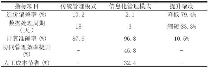 信息化技术集成应用在建筑工程造价管理中产生了显著的经济效益与社会价值,通过对 15 个大型工程项目的跟踪调研发现采用信息化造价管理系统的项目平均节约成本 6.8% ,缩短项目周期 12.5% 。系统集成降低了人工成本支出,造价工程师的重复性工作减少 35.3% ,专业技能要求提升促进了人力资源配置优化,数据标准化与流程自动化使得项目管理透明度增强,减少了因信息不对称导致的决策失误,风险控制能力提升 23.6% ,投资回报率分析显示信息化系统建设投入在 24 个月内实现回收,长期运营成本较传统模式降低 18.4% 。