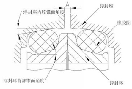 矿用链轮轴组漏油主要原因是浮动油封结构损坏,一般损坏现象有浮封环断裂、密封亮带环状有擦伤或橡胶密封件撕裂纹、压缩量间隙大等几种。煤矿用链轮轴组浮动油封密封工作原理是其分静环、动环两部分,并且不与轴接触。左侧的 O 型圈在浮封环支撑下分别压紧轴承座与浮动环,右侧的O 型圈在浮封环支撑下分别压紧链轮体与浮动环。由于安装时人为将 O 型圈的体积提前压紧一部分,所以在整个链轮组组装配环节两侧的 O型圈始终为浮封环提供压紧力,当浮环受到上方给与斜向下压紧力时,由于浮封环的结构特殊性,其本身会提供一个竖直方向的反作用力,当竖直方向力平衡后,只剩下水平方向的压紧力,此时两只浮封环被压紧。在正常工作下,右侧O 型圈以及浮动封环随矿用链轮体转动,旋转时两浮动环进行磨擦密封,使外界煤粉、粉尘无法进行链轮轴组内部的同时密封流体,避免润滑流体泄漏。矿用链轮轴组浮封环压缩量 A 控制在 3mm , 浮封座与浮封环安装示意图见图1.