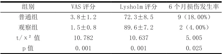 干预后,观察组 VAS 评分低于普通组,Lysholm 评分高于普通组( P<0.05 );观察组 6 个月内损伤发生率显著低于普通组( P<0.05 )。详见表2。