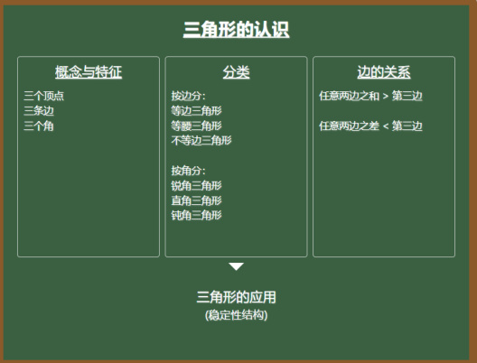 师:今天我们学习了三角形的基本概念、特性、分类以及边的关系。我们知道了: