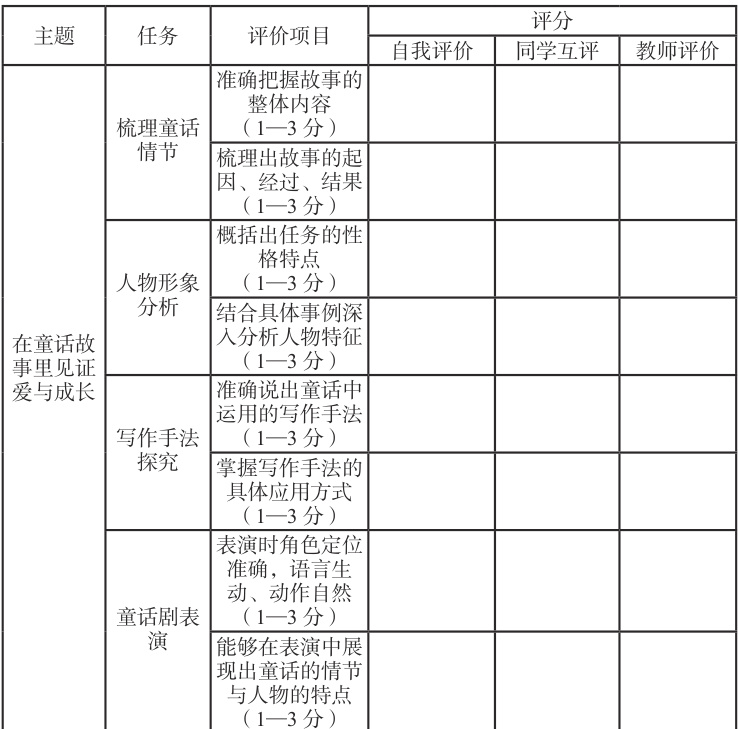 在单元主题教学视域下,教师运用任务驱动策略组织教学活动时可以采用以下几种评价方式:第一,注重评价主体多元,引导学生参与到评价环节中。学生可以通过自评总结自己的优点与不足,也可以通过互评进行相互借鉴。如:学生完成童话剧表演后,可以相互评价组内成员对童话人物的掌握情况(评价依据见下表)。第二,做好过程性评价。教师要认真观察学生完成任务的过程,比如学生是否积极发言、是否能够针对任务提出有价值的见解、是否善于倾听他人观点等。第三,尊重学生差异,进行个性化评价。针对不同水平的学生,教师提出的评价要求要体现出差异。